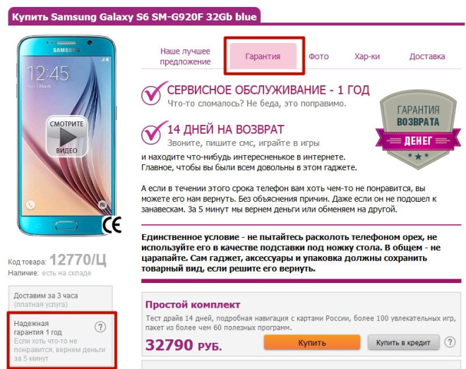 Этот контент должен быть легко доступен. Отличный пример можно видеть в интернет-магазине Video-shoper, там есть отдельная вкладка с информацией о гарантиях, а также подпись под фото товара.