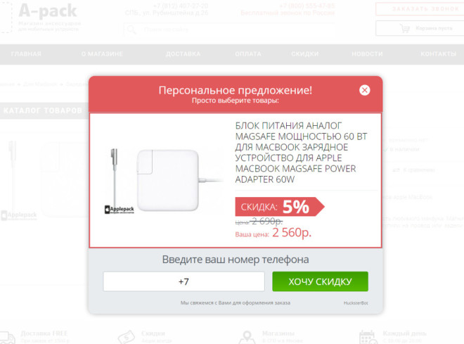 С другой стороны, вы можете выводить всплывающее окно, которое будет появляться для определенного сегмента посетителей, и также предлагать посетителю скидку. Недавно, мы публиковали кейс интернет-магазина мобильных аксессуаров, который рассказал как увеличил конверсию на 35%.